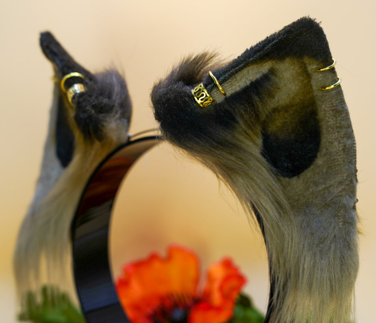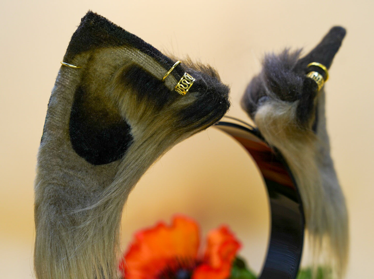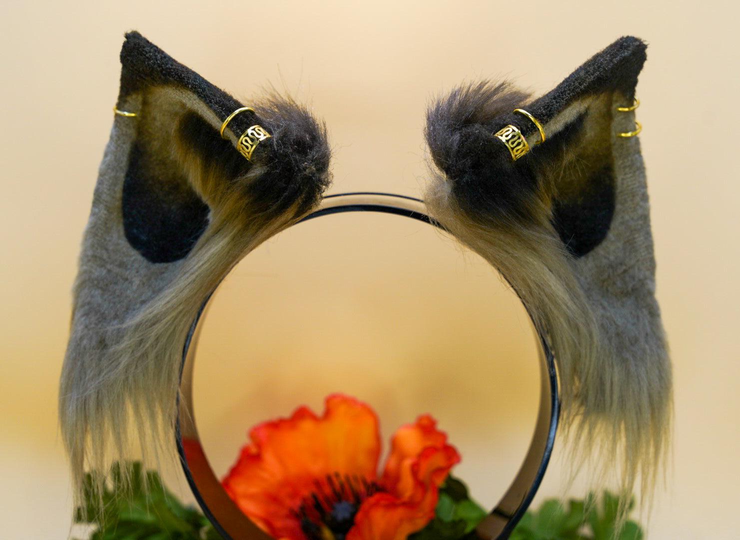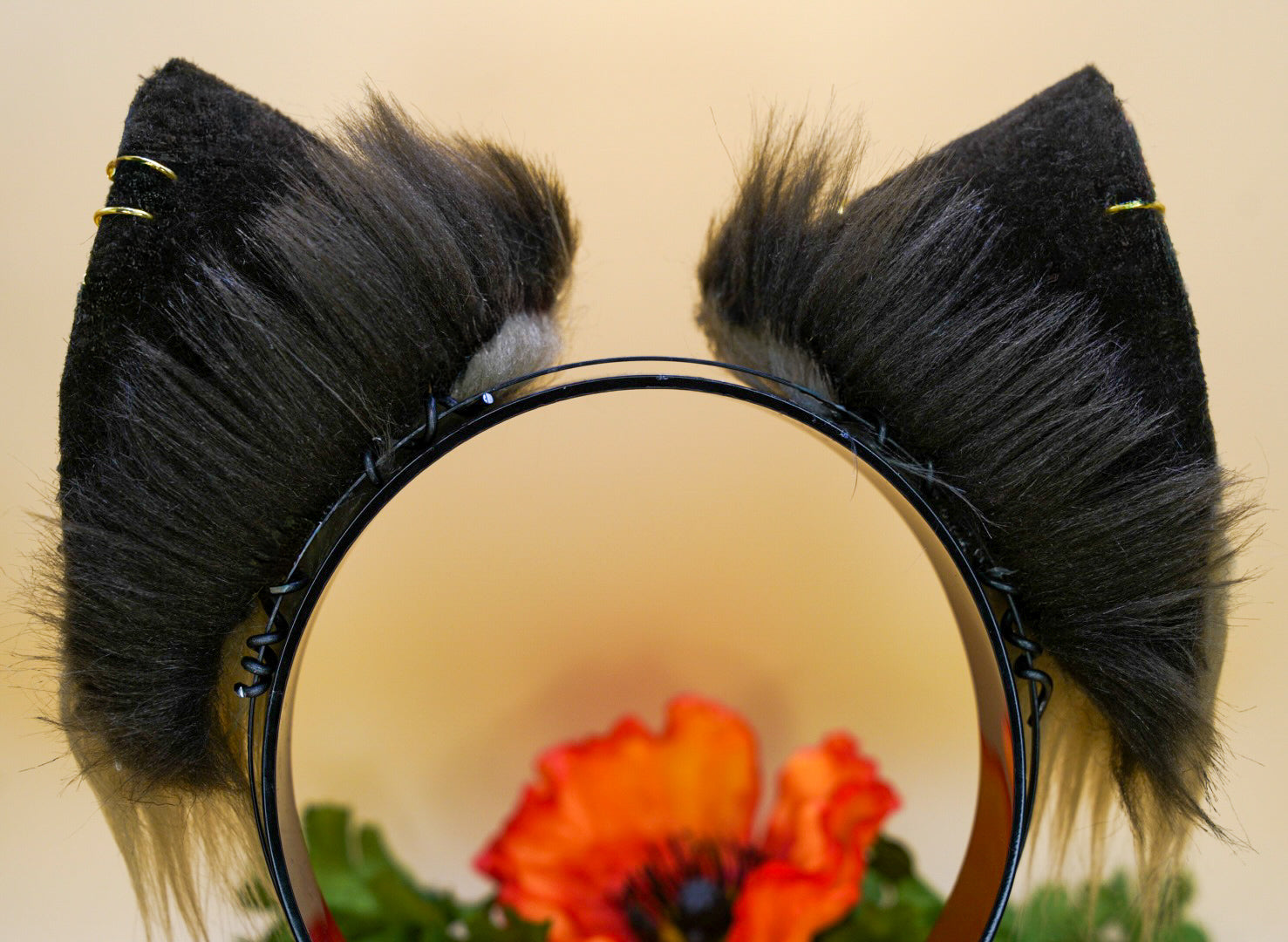 Handcrafted ears made from high quality faux fur included with ear cuffs, and hoops as shown in the photo; ear cuff available in silver, gold, or black (Specify in checkout notes or color will be chose at random). The ears are attached to a thin metal headband & they can be moved up and down along it for your own desired look They are also wired and able to be posed to your liking. Last photo shows ear shapes you can pick from, which will come in the same color scheme as the first photos.