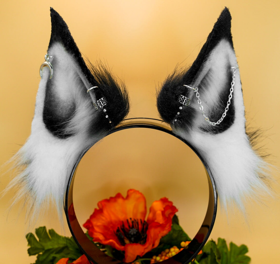 Handcrafted ears made from high quality faux fur included with ear cuffs, hoops, chain, and silver moon charm as shown in photo; if you wish to change the color of the ear cuffs, chain (gold, silver, or black) or included hoops, please specify in checkout notes or I will choose at random. The ears are attached to a thin metal headband & they can be moved up and down along it for your own desired look They are also wired and able to be posed to your liking. Last photo shows ear shapes you can pick from, which will come in the same color scheme as the first photos.